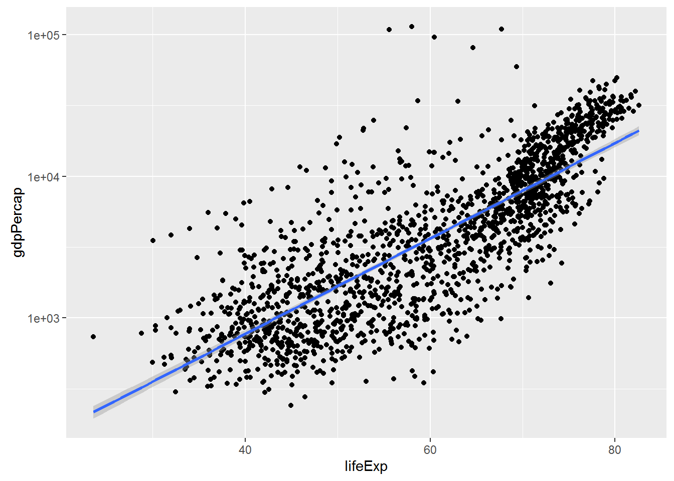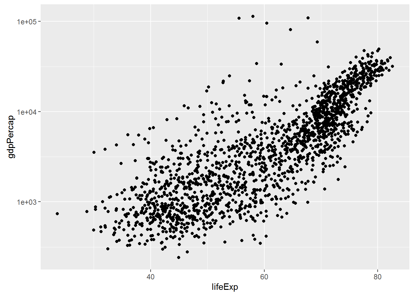 Currently it’s hard to see the relationship between the points due to some strong outliers in GDP per capita. We can change the scale of units on the y axis using the scale functions. These control the mapping between the data values and visual values of an aesthetic.