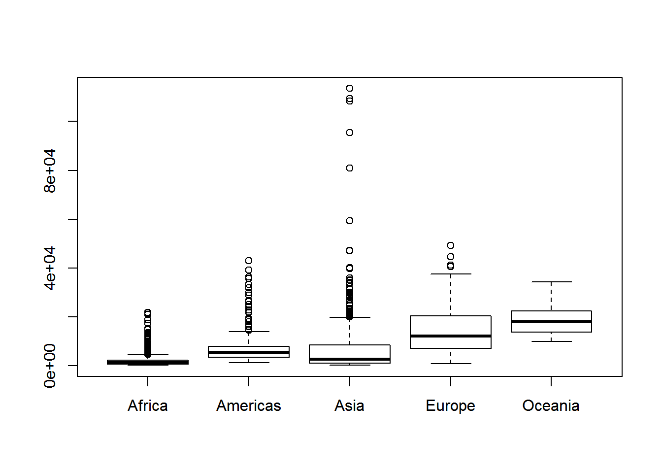 boxplot(gdpPercap ~ continent, data=gapminder)