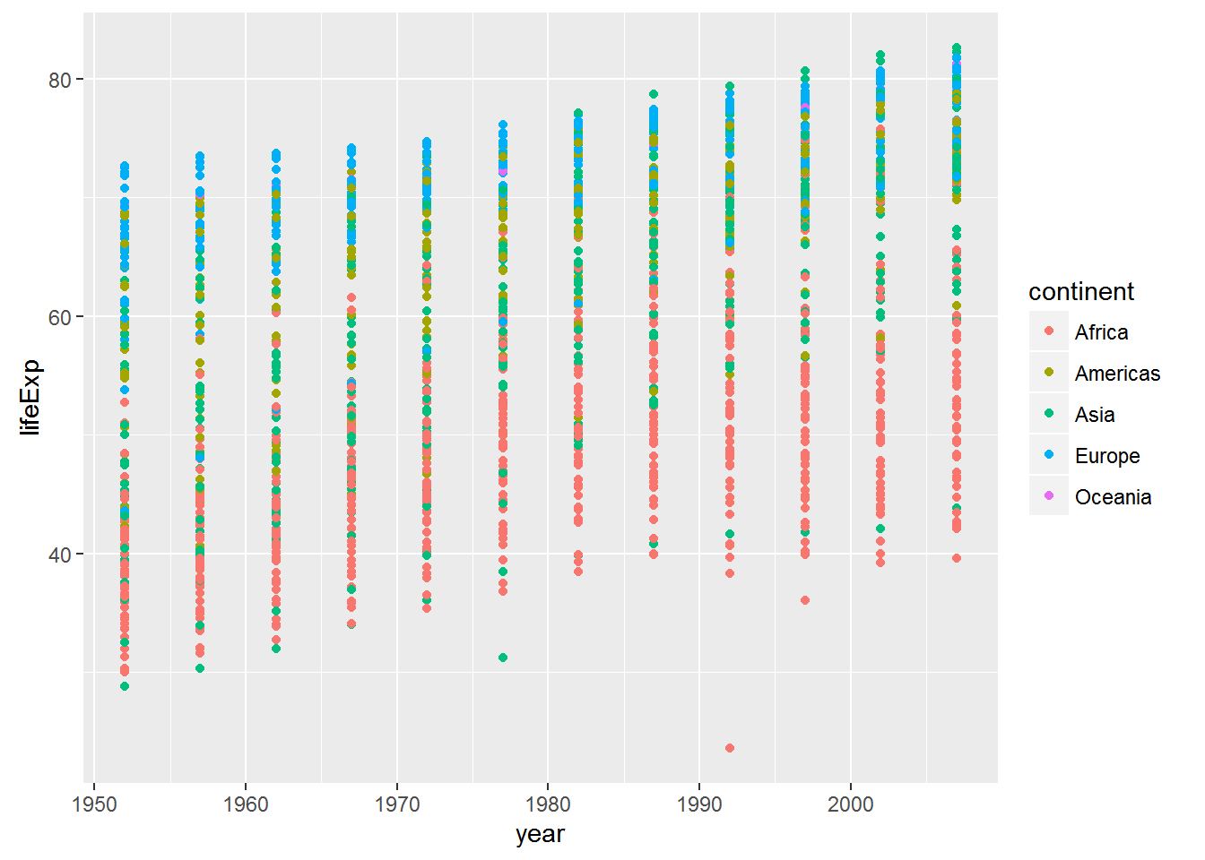 aesfunction to tell the scatterplot geom about the x and y locations of each point. Another aesthetic property we can modify is the point color. Modify the code from the previous challenge to color the points by the “continent” column. What trends do you see in the data? Are they what you expected?ggplot(data = gapminder, aes(x = year, y = lifeExp, color=continent)) + geom_point()