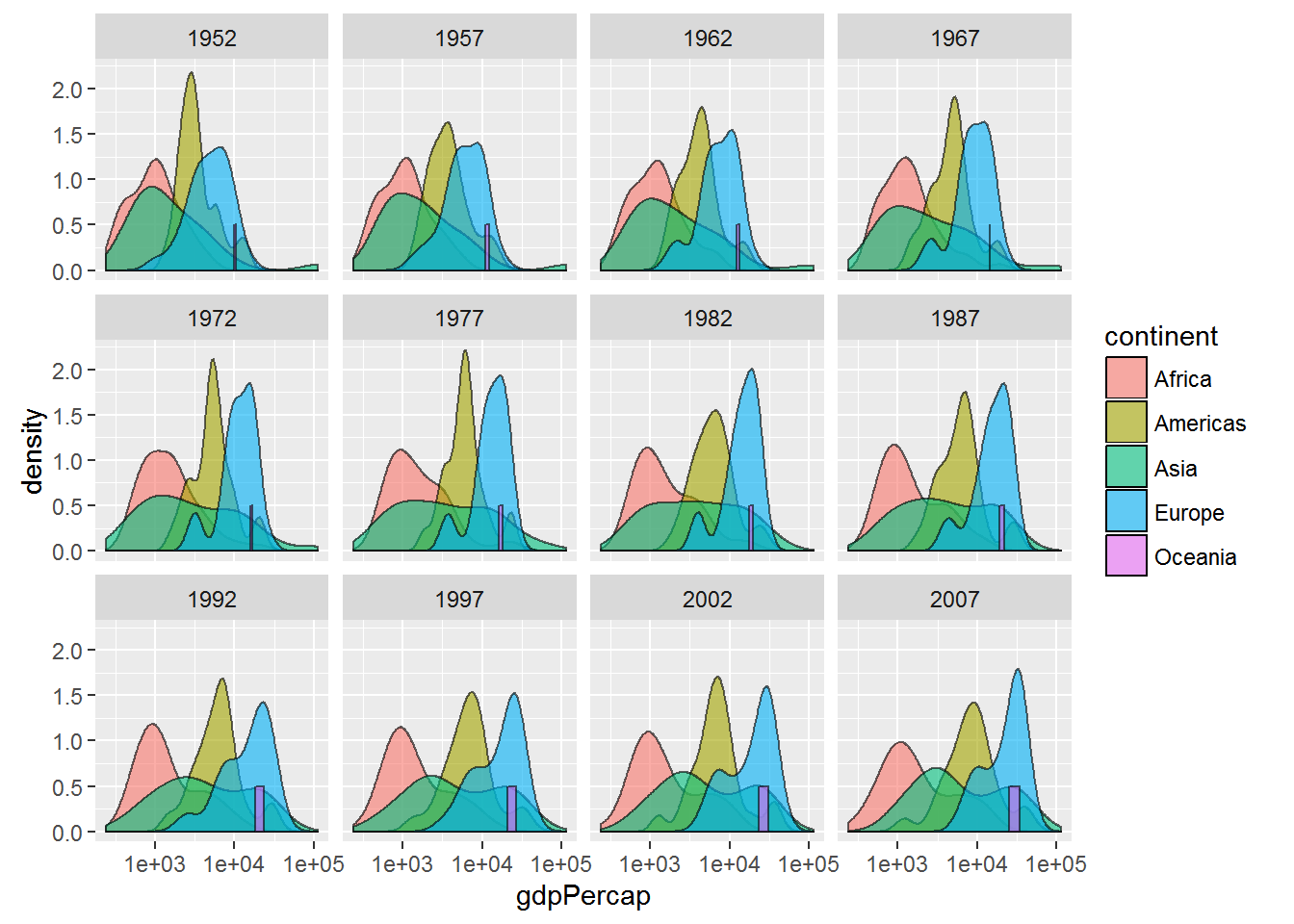 ggplot(data = gapminder, aes(x = gdpPercap, fill=continent)) + geom_density(alpha=0.6) + facet_wrap( ~ year) + scale_x_log10()