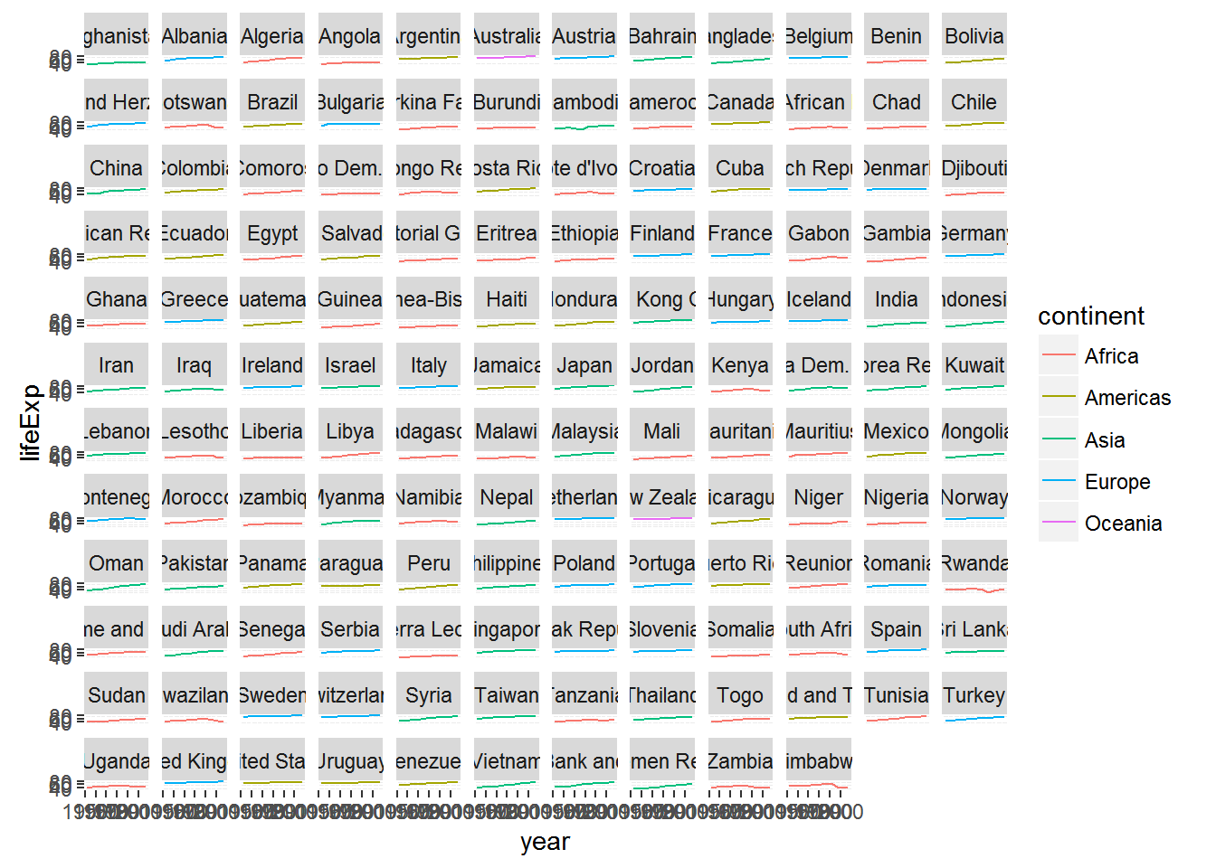 Earlier we visualised the change in life expectancy over time across all countries in one plot. Alternatively, we can split this out over multiple panels by adding a layer of facet panels: