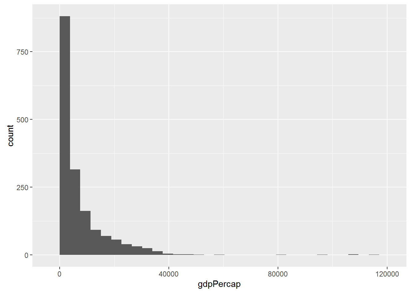 ggplot(gapminder, aes(x = gdpPercap)) + geom_histogram()## `stat_bin()` using `bins = 30`. Pick better value with `binwidth`.