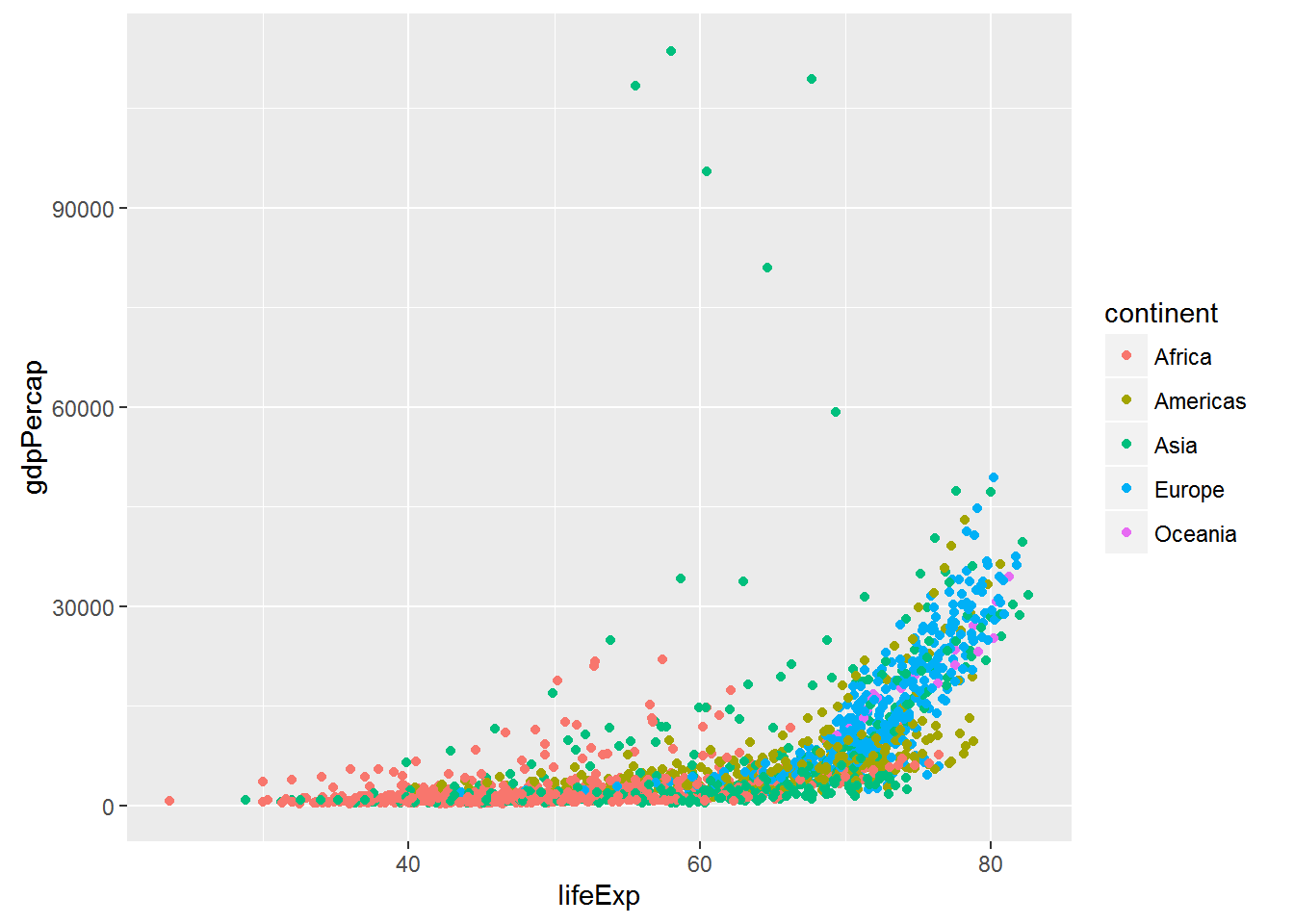 aesfunction to tell the scatterplot geom about the x and y locations of each point. Another aesthetic property we can modify is the point color. Modify the code from the previous challenge to color the points by the “continent” column. What trends do you see in the data? Are they what you expected?
