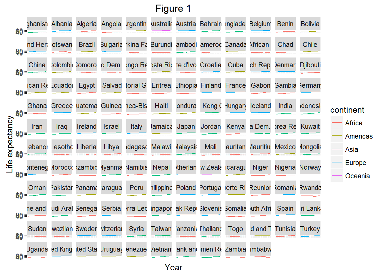 xlab("Year") + ylab("Life expectancy") + ggtitle("Figure 1") +