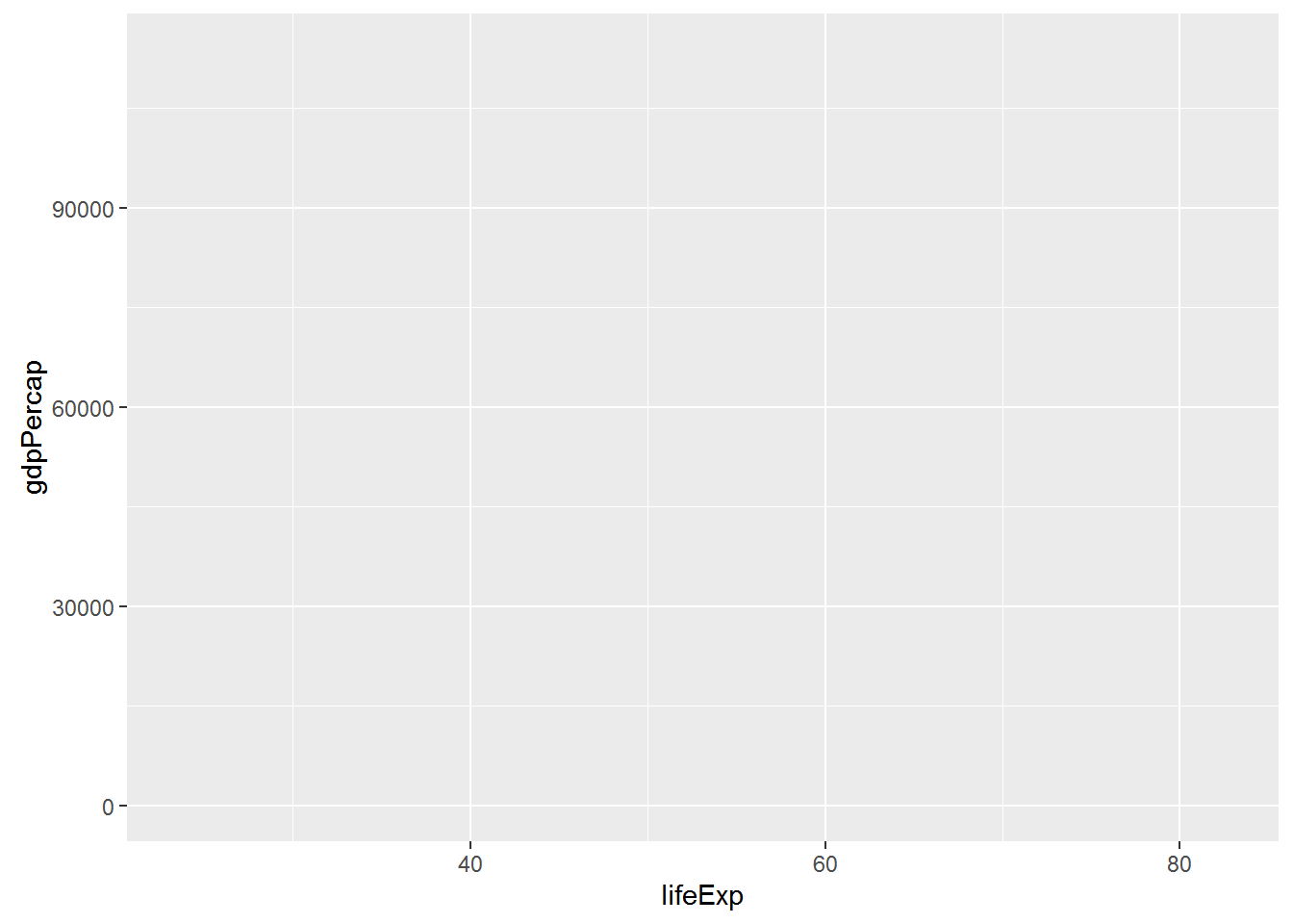 We’ve passed in two arguments to ggplot. First, we tell ggplot what data we want to show on our figure, in this example the gapminder data we read in earlier. For the second argument we passed in the aes function, which tells ggplot how variables in the data map to aesthetic properties of the figure, in this case the x and y locations. Here we told ggplot we want to plot the “lifeExp” column of the gapminder data frame on the x-axis, and the “gdpPercap” column on the y-axis. Notice that we didn’t need to explicitly pass aes these columns (e.g. x = gapminder[, "lifeExp"]), this is because ggplot is smart enough to know to look in the data for that column!